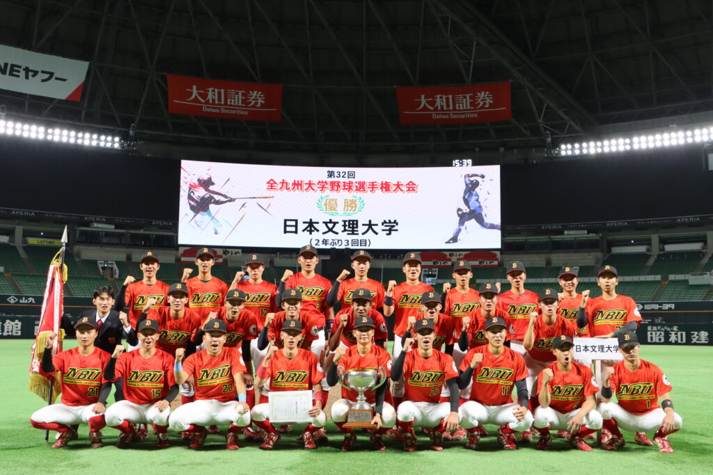 日本文理大学が10月29日に開催された「第32回全九州大学野球選手権大会」の決勝戦(みずほPayPayドーム福岡)で北九州市立大学に4-0で勝利し、2年ぶり3回目の優勝を果たしました。